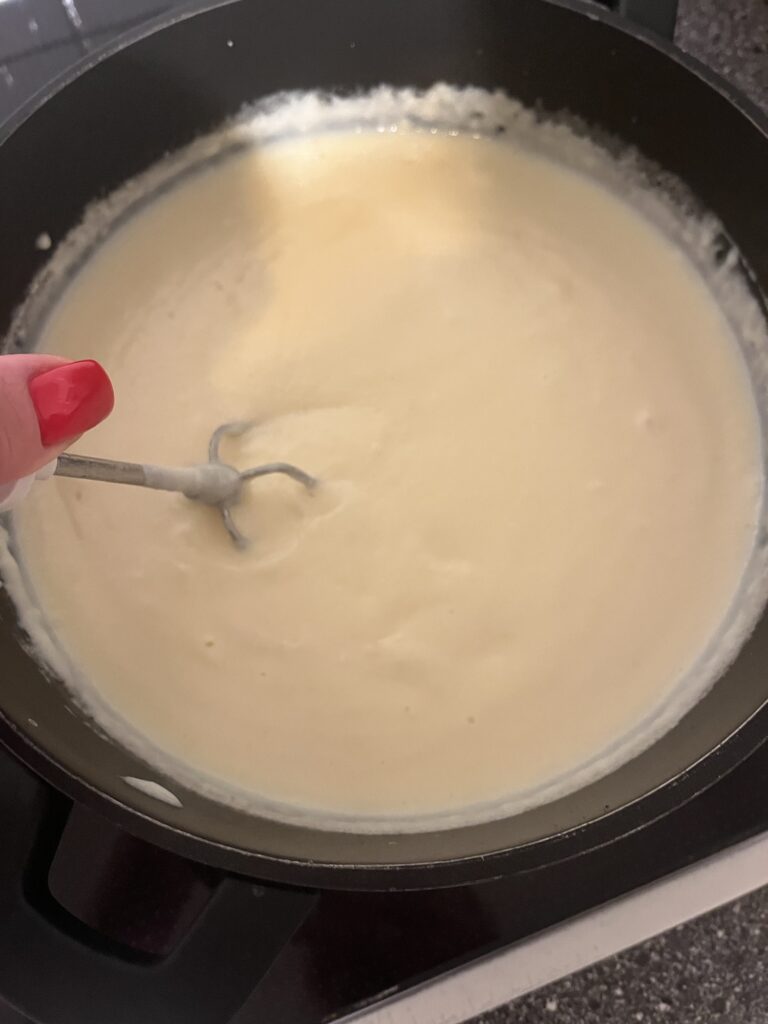 Crema se amestecă continuu până capătă o consistență fină și groasă.