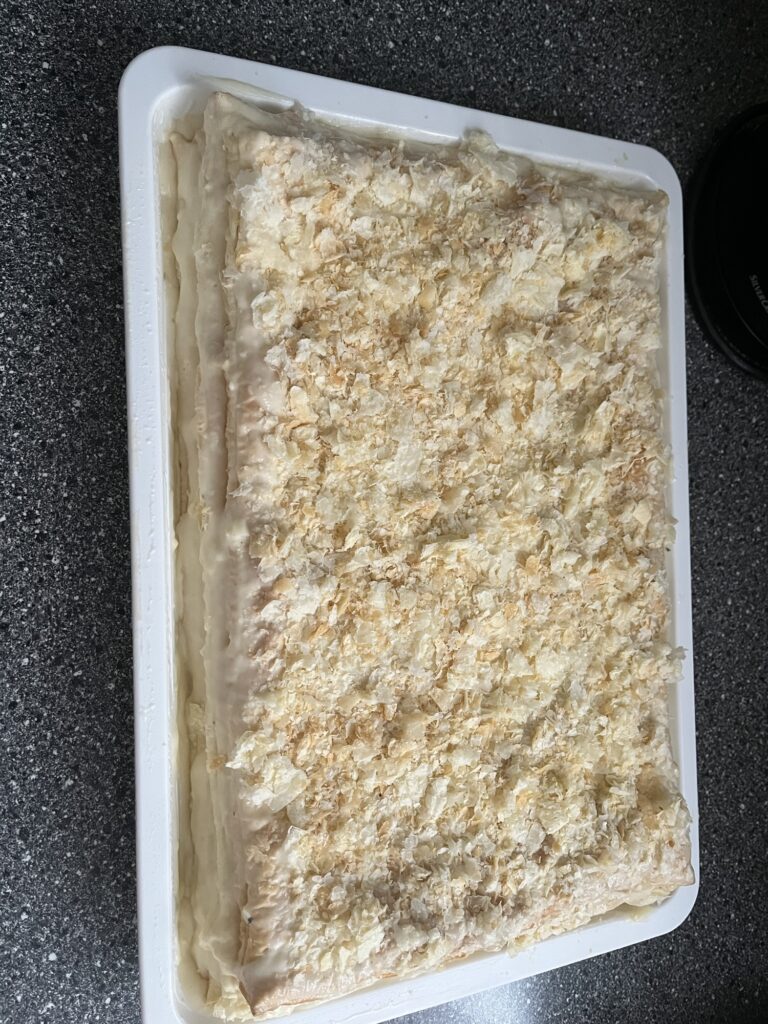 După câteva ore, tortul se taie ușor, iar foile devin moi și cremoase.