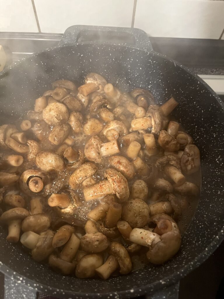 1 kg ciuperci champignon 30 g unt 1–2 linguri ulei de măsline aproximativ 10 linguri sos de soia (pentru sushi) condimente după gust (piper, usturoi granulat, boia, ierburi aromate)